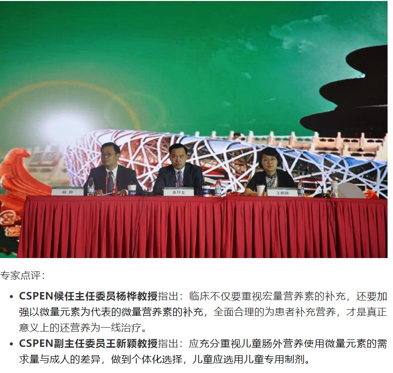 视频突出了共识给临床带来的意义。北京医院朱明炜教授指出:对于长期接受肠外营养的外科患者,常规补充微量元素是十分必要的,对于术后康复具有积极意义。上海市儿童医学中心洪莉教授指出:儿科患者应使用不含铬的、婴幼儿和儿童的专用制剂。为了便于推广应用,共识提出十二条明确推荐意见。北京协和医院康维明教授指出:共识汇聚了近几年微量元素的临床研究成果,带动了微量元素在营养治疗中的快速发展。
