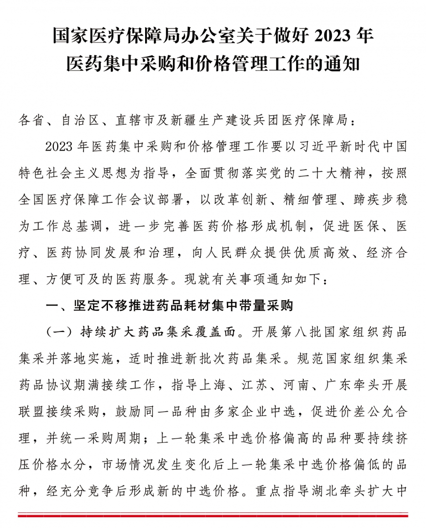 国家医疗保障局办公室关于做好2023年医药集中采购和价格管理工作的通知