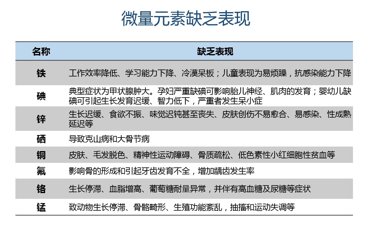 微量元素在机体内有一定的储备,当储备被消耗,可能会先表现出对应缺乏的症状,进而引起血中水平下降。微量元素缺乏表现:(如下图)