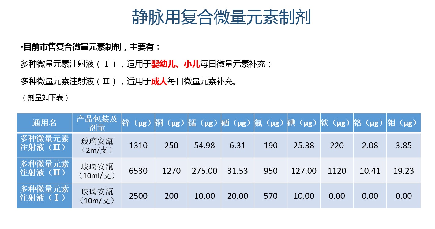 3、鉴于新生儿和儿童肠外营养用药的特殊性和安全性考虑,临床应使用婴幼儿和儿童专用的微量元素补充制剂。