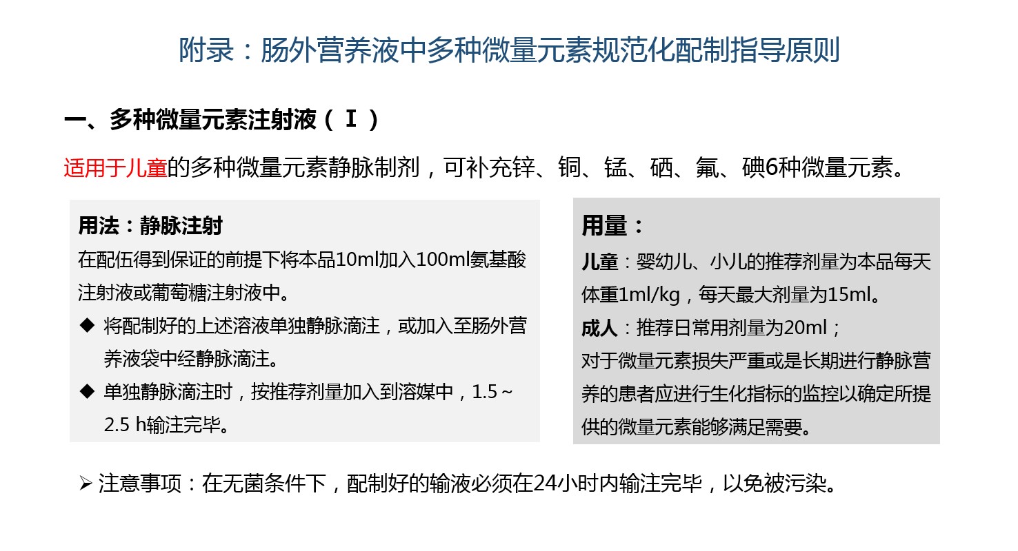 儿童微量元素补充剂量采用的是上海新华医院蔡威教授牵头编写的《中国新生儿营养支持临床应用指南》中推荐的剂量,成人目前国内没有统一的推荐剂量,临床常采用ESPEN2004、ASPEN2012、AuSPEN2014的指南或共识推荐的剂量。